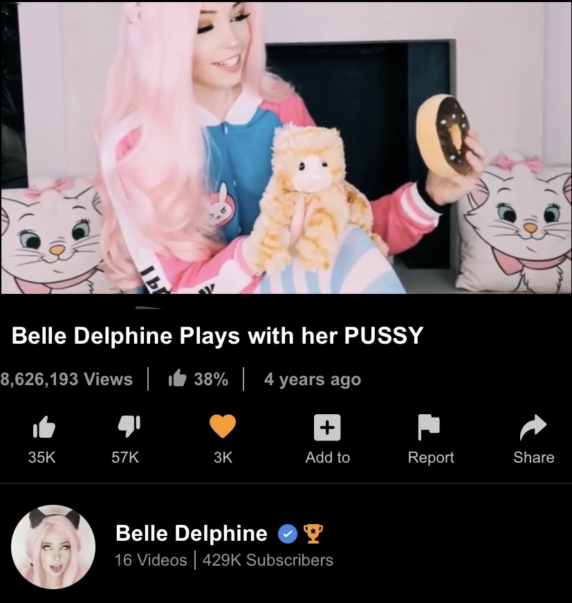 Belle Delphine is a fin-de-siècle-born Zoomer who, like many members of her generation, has a digital footprint spanning nearly half her life. This means that the truly curious can find the YouTube channel she created as a kid named Belle Kirschner: said channel has only 311 subscribers—though the three videos have views in the thousands, numbers which likely accumulated as a result of the fame she's achieved as an adult.